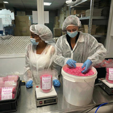 Chaque sachet de cire est pesé et contrôlé à la main dans un atelier aux normes strictes, pour une cire de qualité à chaque commande.